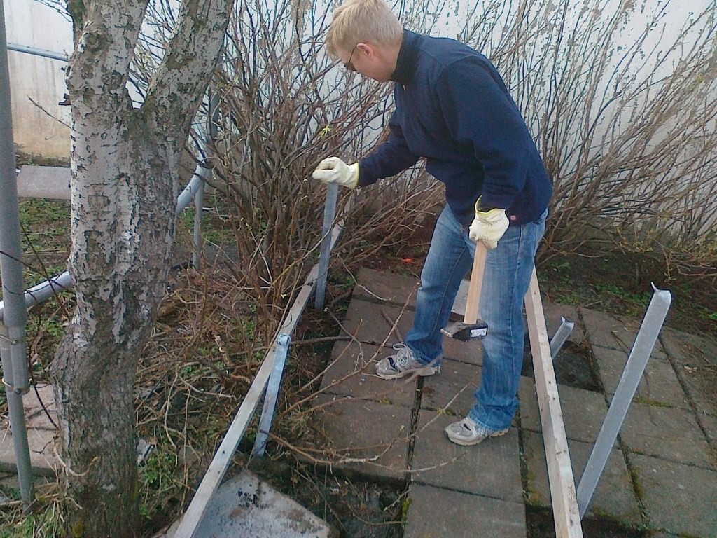Hann byrjaði á því að leggja 3 dregarana þar sem húsið átti að verða sett niður. Svo fór hann að berja…